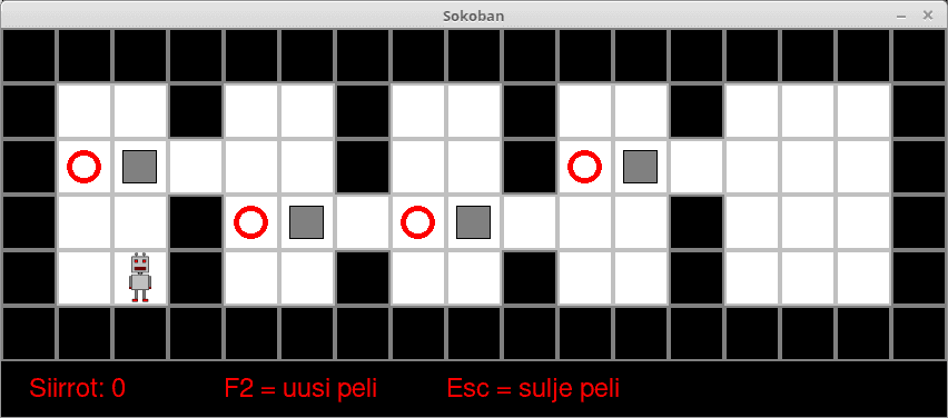 In this part we will use pygame to create a somewhat larger game. It is a variation of the classic Sokoban game, where the player moves a robot on a grid and pushes boxes into correct locations with as few moves as possible.