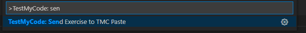 With your solution open in the editor, click the TMC menu button in Visual Studio Code (next to the eye symbol). This opens a menu where you can look for the TMC Paste feature by typing in send: