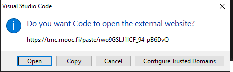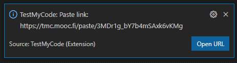 Select the option Send Exercise to TMC Paste, and there should be a notification in the bottom right hand corner of the window telling you that the source code has been sent to the TMC server: