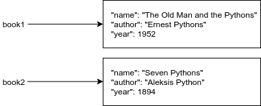 print(book["name"])In both cases we are creating a new object. In programming, the term has the specific meaning of an independent whole, in this case containing some bits of data which are somehow related. Being independent means that any changes made to one object will not affect other objects.