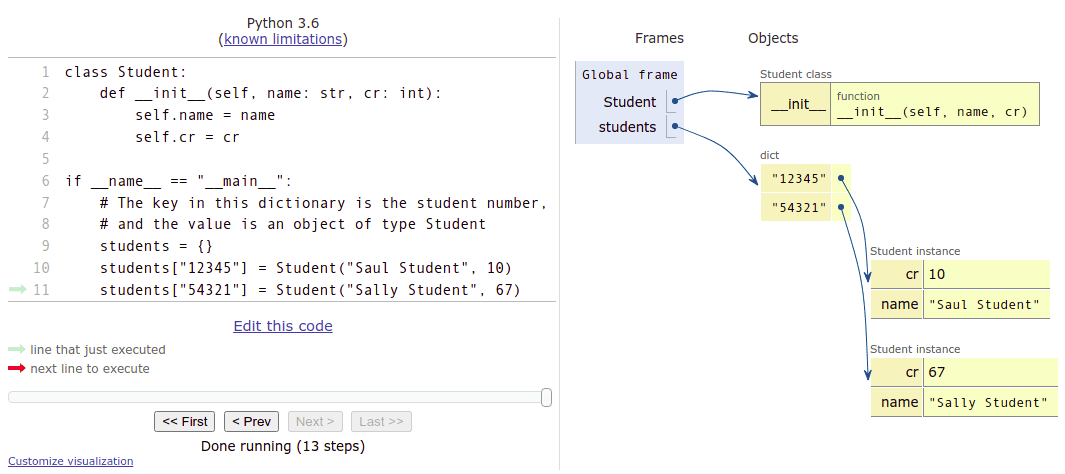 students["54321"] = Student("Sally Student", 67)The visualisation tool can help in making sense of the above example: